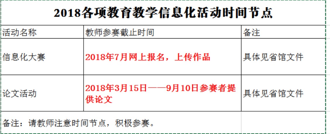 根据市教育局《转发关于开展2018年全省教育教学信息化系列活动的通知》要求,现将《关于开展2018年全省教育教学信息化系列活动的通知转发给你们,请各校广泛宣传,积极组织教师参加相应的活动,并充分利用“信息化系列活动”平台,鼓励和帮助教师利用信息化创新教学模式,进一步提升我县教师信息技术应用能力。