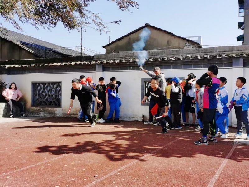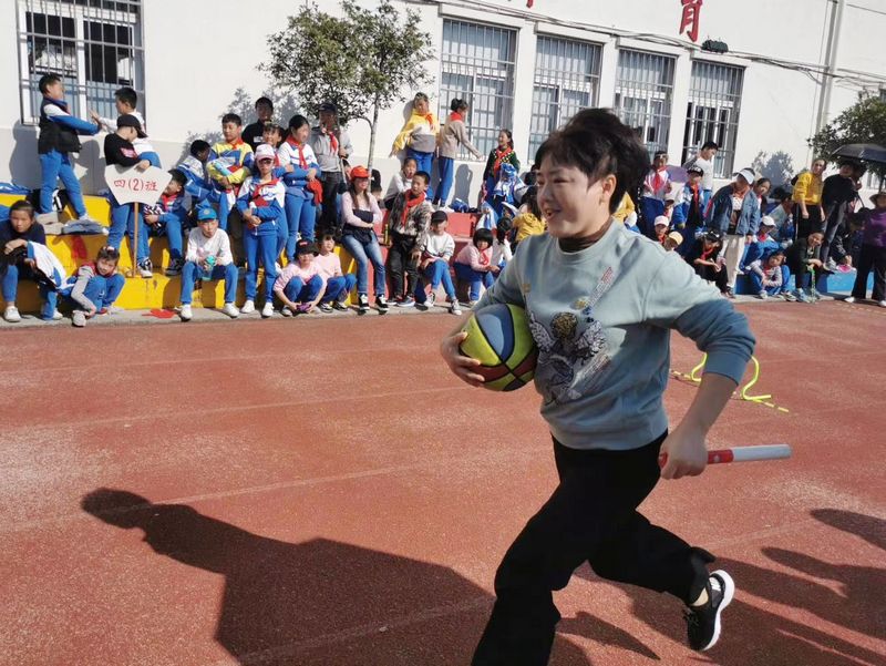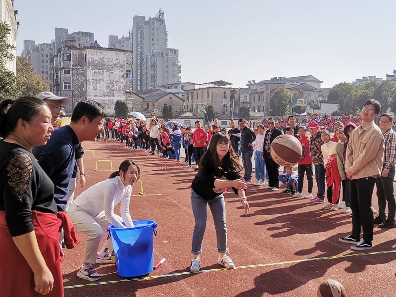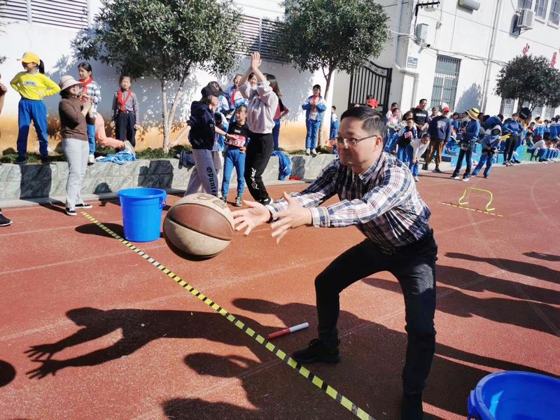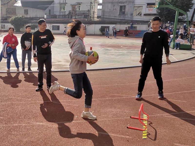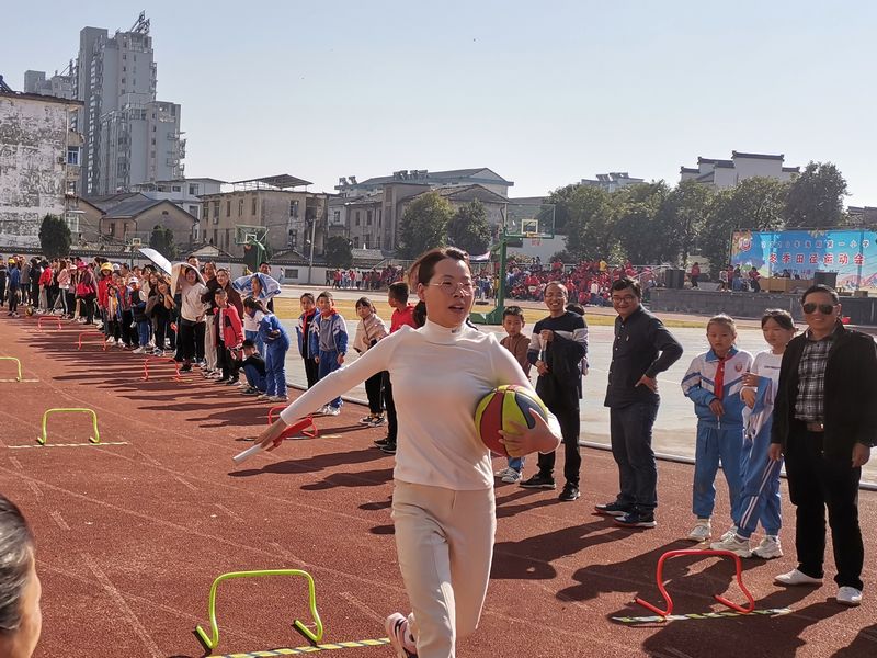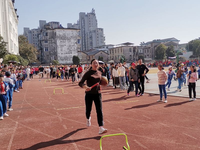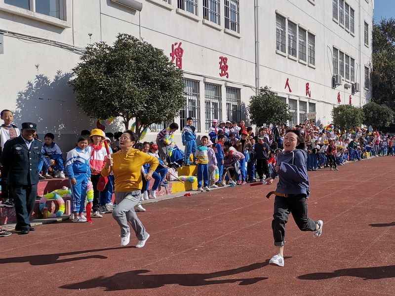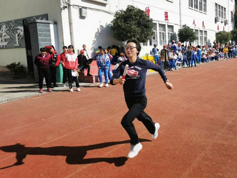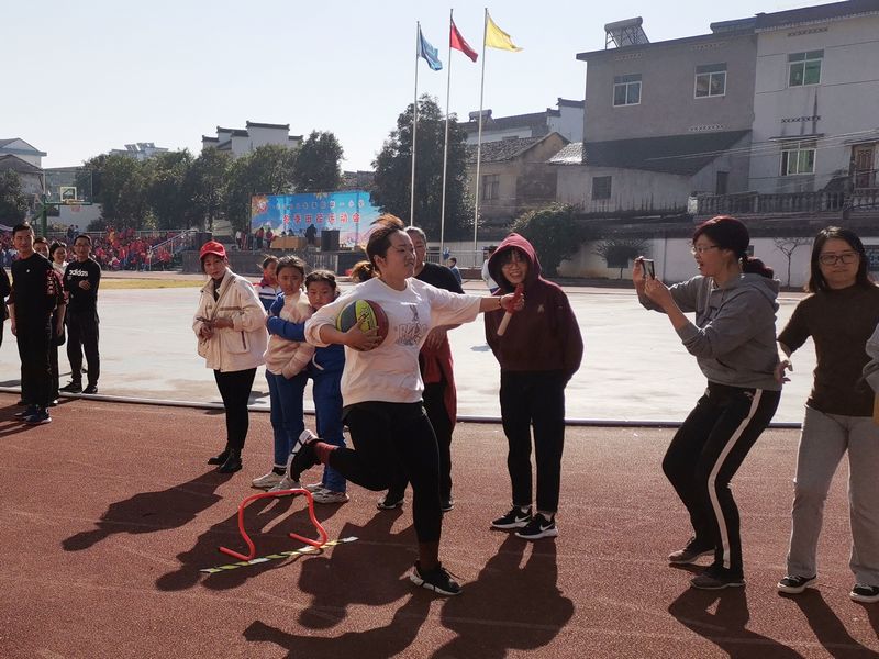 休宁县海阳第一小学工会为丰富教职工生活,在校运会期间开展了教职工趣味接力赛。