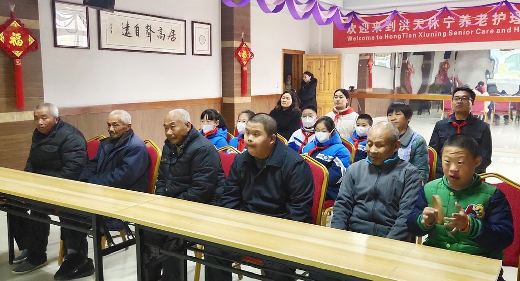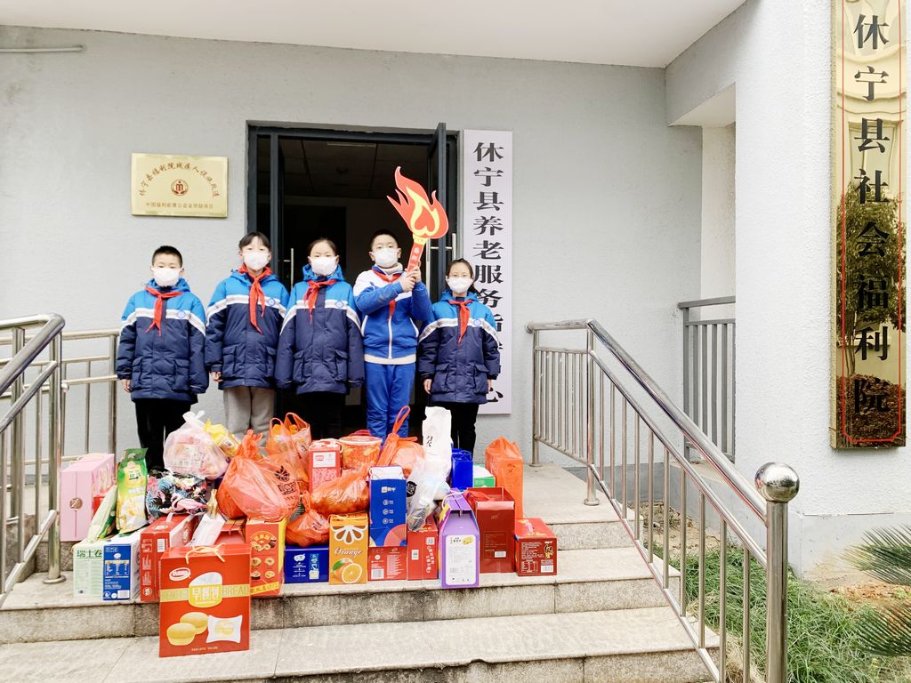 两位辅导员和五位少先队员带着录制好的节目与祝福视频,以及孩子们送给老人们的礼品,来到了休宁县福利院。孩子们与老人们一起观看了录制节目,为老人们打扫卫生,整个福利院充满了欢声笑语。