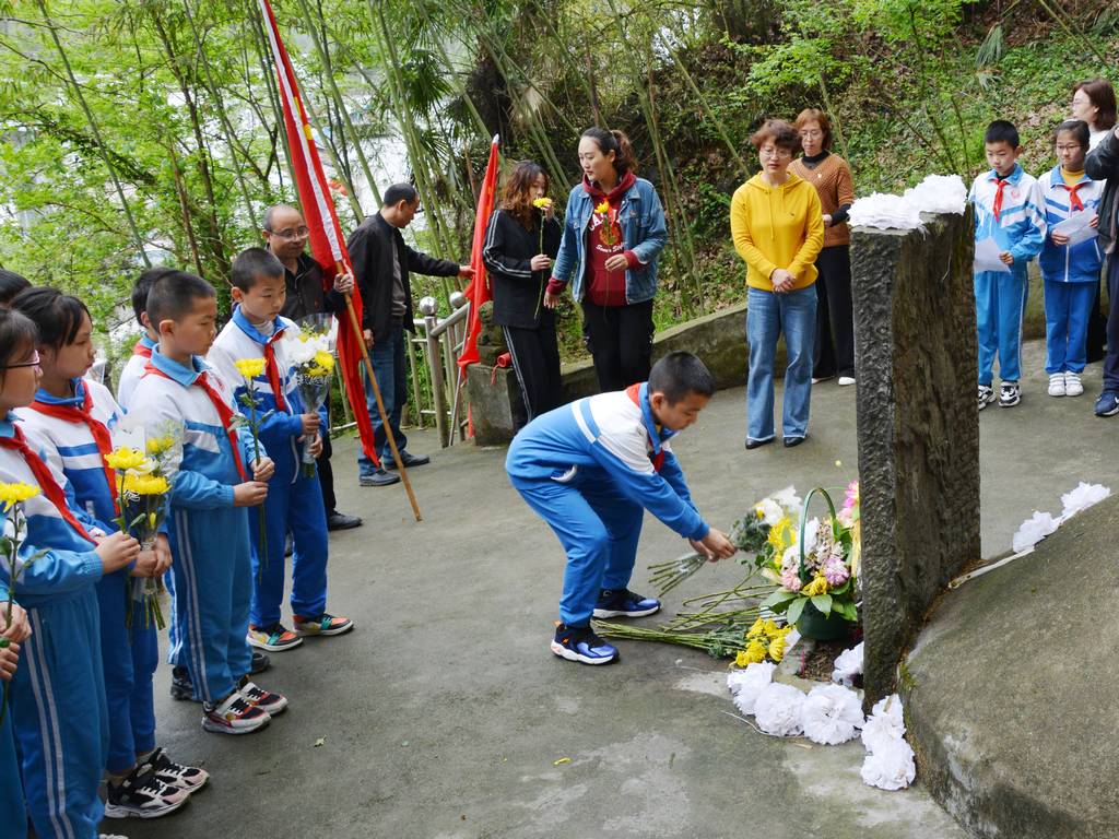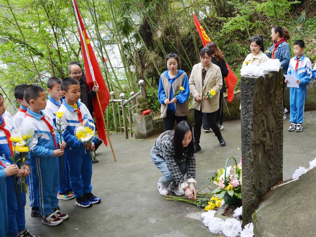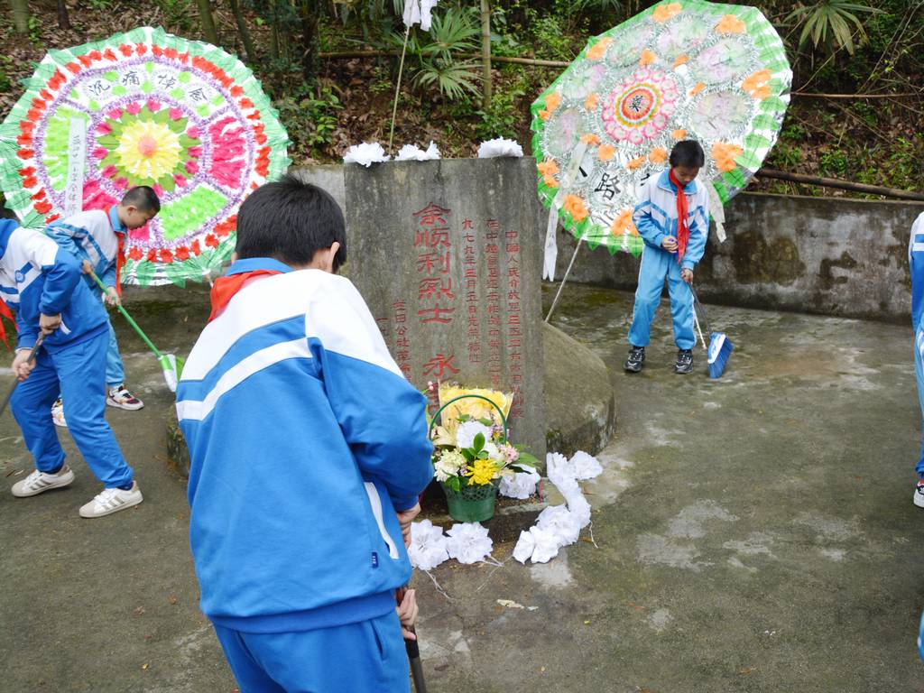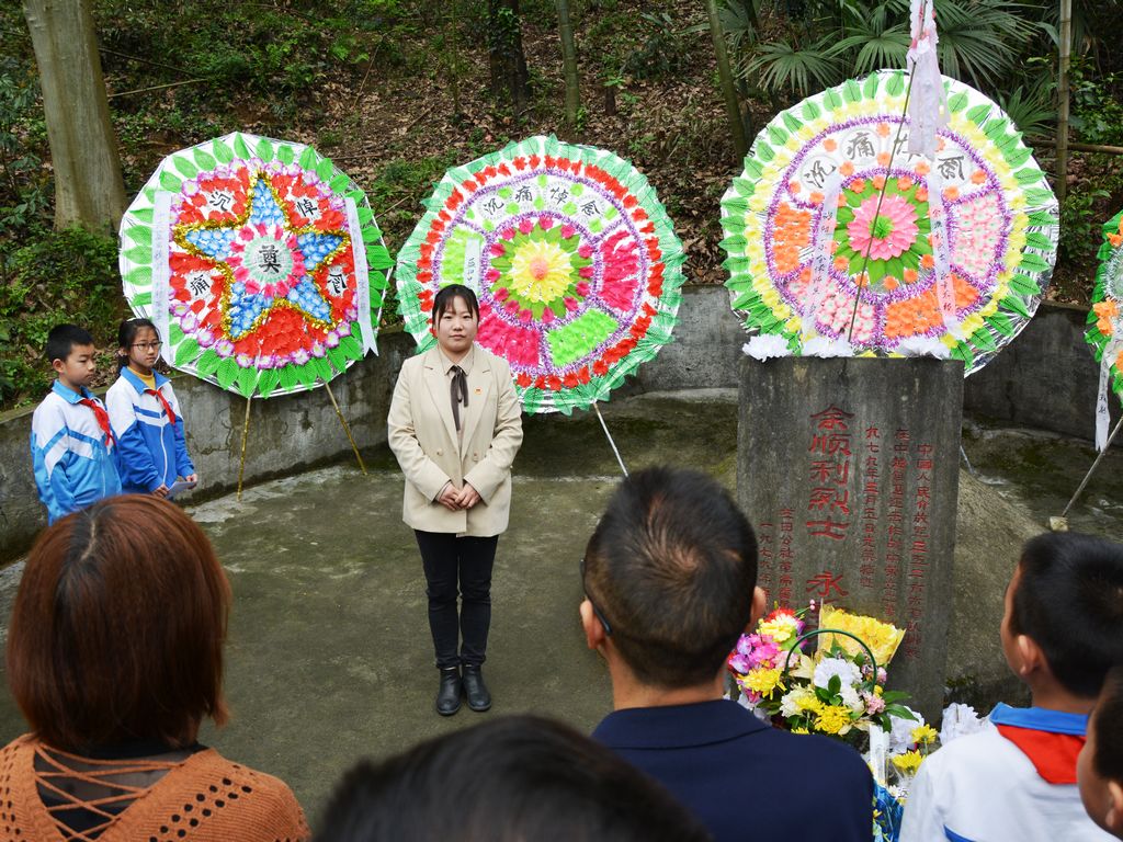教师及学生代表肃立在烈士墓前,庄严的《国际歌》响起,开始了庄严的祭扫仪式。清扫烈士墓后,党员代表向烈士墓敬献花圈,全体师生向烈士墓敬献鲜花,全体默哀3分钟,寄托对英烈的无限哀思。