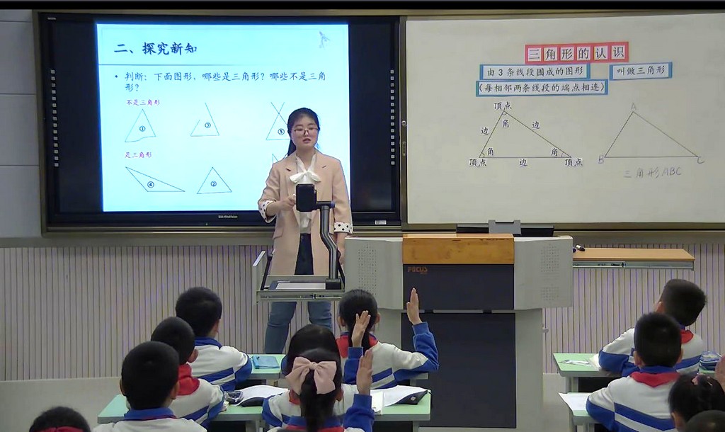 此次同课异构的课题是人教版小学数学四年级下册《三角形的认识》,分别由海阳一小凌茹晴老师、万安小学韩秀女老师、江潭小学余萍老师、月潭湖小学姚瑾老师执教。四位老师同台竞技亮风采,同课异构显新意。凌茹晴老师的讲解精准到位,韩秀女老师的练习趣味十足,余萍老师的互动氛围浓厚,姚瑾老师的言语简练实用。