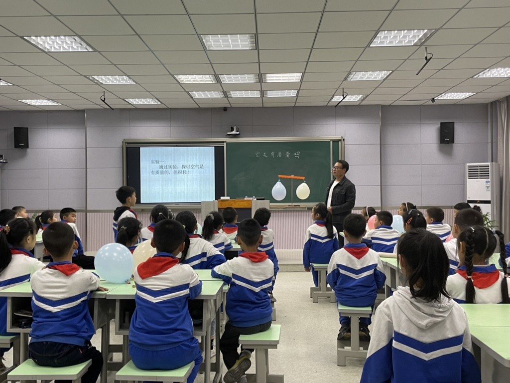 本次活动中,海阳一小汪建义老师执教了一堂科学课——《空气有质量吗?》,在课中汪老师精心设计了丰富、严谨的科学探究实验,从学生生活经验出发,以“牛奶和苹果谁重?”为教学起点,层层深入,步步为营,为学生亲历科学,感受科学,体验科学提供了丰富的机会。用科学实践让学生切实明白了“空气是有质量的,但空气的质量很轻”。