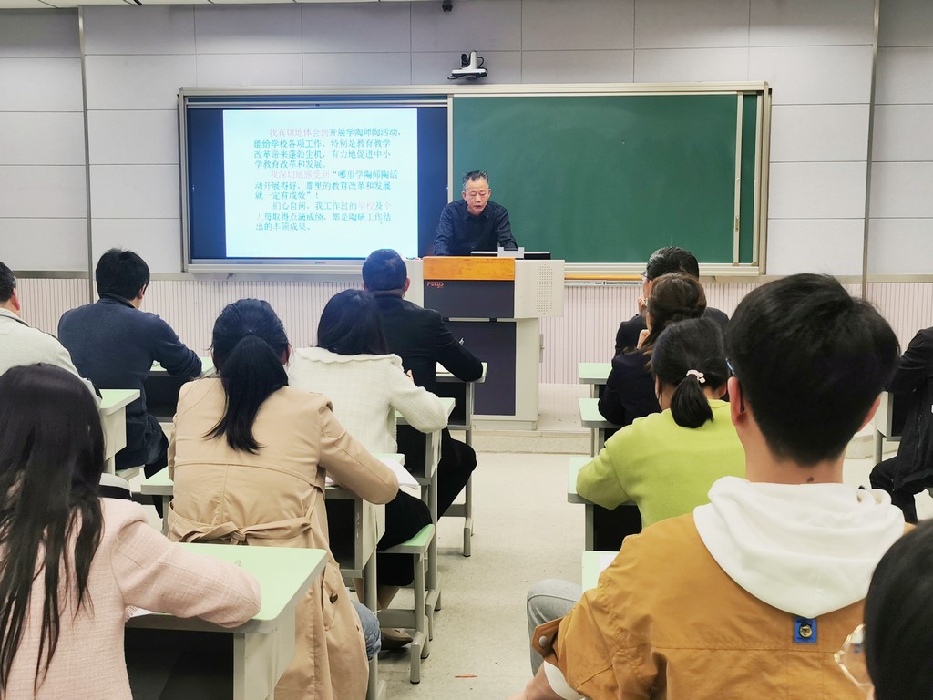 随后,安徽省特级教师、“全国陶研先进个人”汪志平副校长受邀为集团校教师先后作了题为《以陶为师,有效打造“一校一品”》以及《以课题研究为引领,促进学校改革发展》的专题讲座。汪校长从“一校一品”的含义、原则、资源途径以及实施案例等方面作了详细的解读,并强调课题研究对学校发展和教师个人成长的重要作用。
