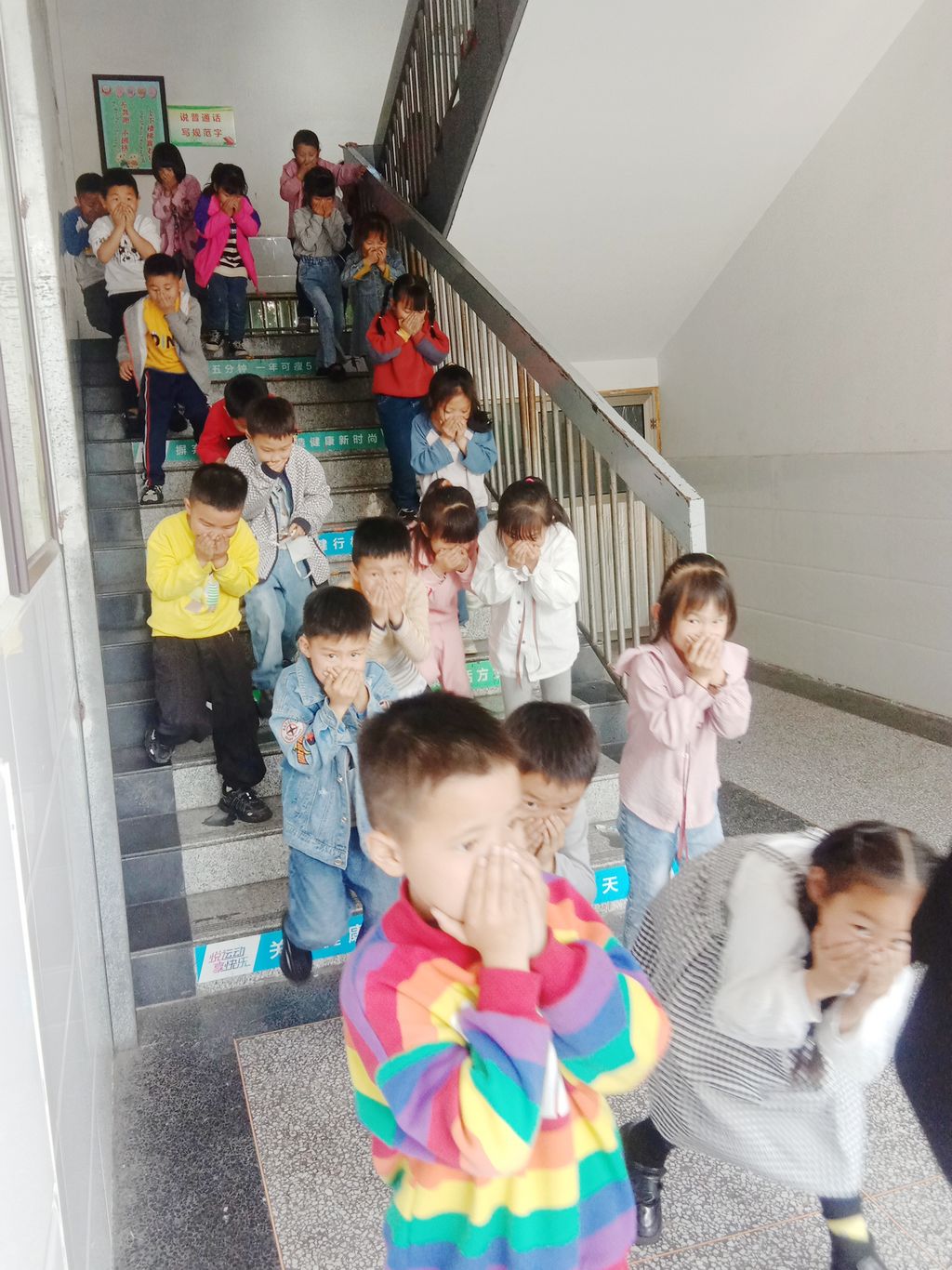 随着警报声的响起,海阳一小一年级全体师生迅速进入紧急疏散状态,现场班主任快速安排学生做好疏散前的准备,在老师的带领下,全体学生用手捂住口鼻有序撤出教室;楼层引导员指明师生的疏散方向,楼梯拐角安全员在高声的提醒师生;按照逃生演练方案设定的逃生路线,迅速而有序地从各教学楼、各层、各班撤离到指定位置。学生到达目的地后,快速整队并核查人数,短短3分20秒,整个应急演练活动规范、有序、紧凑、安全、高效。