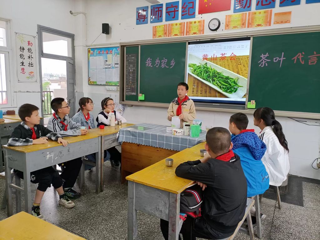 5月9日,休宁县海阳一小六(6)班利用课后延时服务时间,开展了“我为家乡茶叶代言”的综合实践活动。活动前,布置学生利用“五一”假期进行采茶,了解茶叶的制作过程,并动手设计茶叶包装袋。活动中,先推选部分学生作为评委,再分别展示茶叶设计包装,介绍茶叶特点及功效,并泡制茶水给评委品尝,评出“最美茶叶包装”、“最佳代言人”和“优质茶叶”奖项。最后,全班同学一起品尝家乡的茶叶,整个教室茶香四溢。