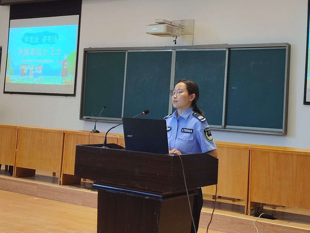 本次活动邀请到了司法局工作人员给同学们上了一堂意义深远的普法课。司法局汪阿姨结合生活实际,列举鲜活的例子,进行深入浅出的讲解,使同学们对宪法有了初步的了解。活动中,不仅发放了有关宪法知识的宣传资料,还穿插了宪法知识抢答,同学们积极参与互动,兴趣盎然。