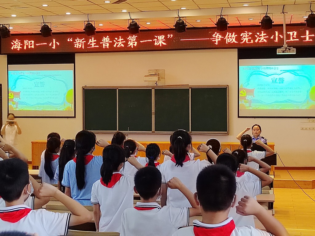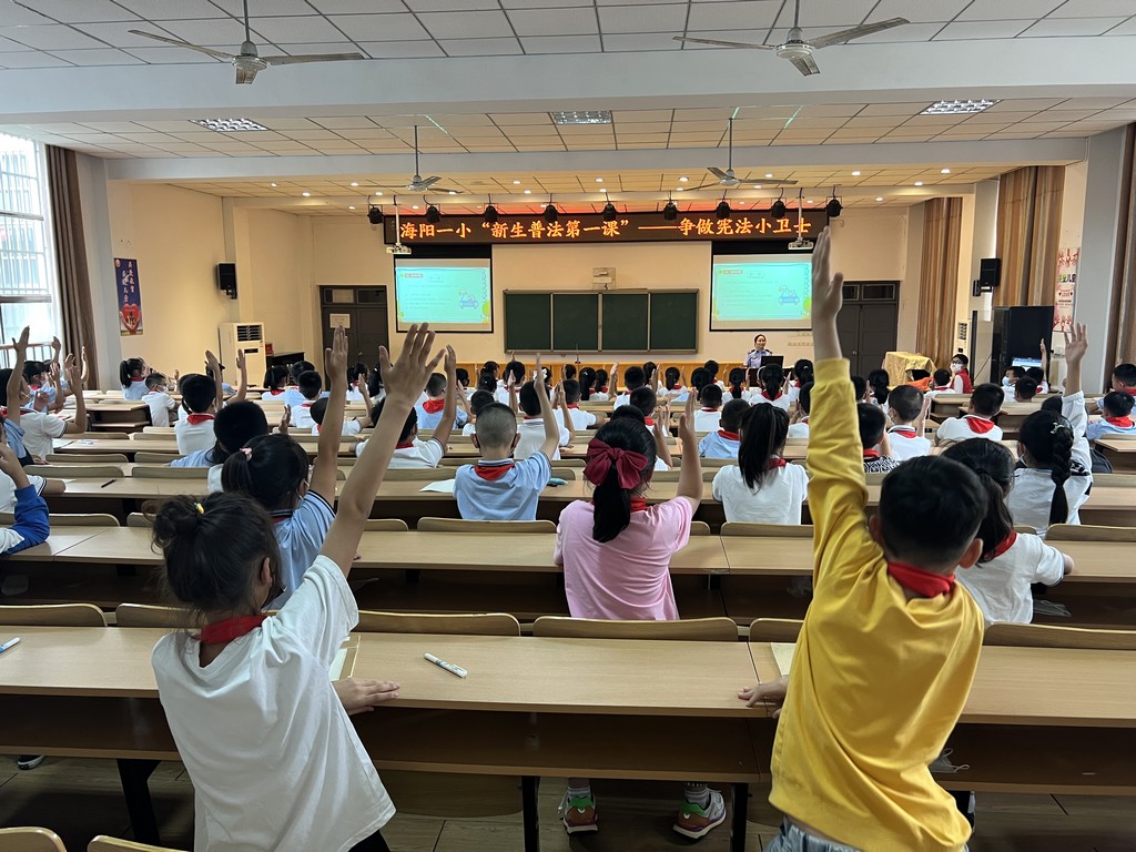 开学第一天,海阳一小开展了“学宪法、讲宪法、争做宪法小卫士”主题教育活动,此次活动是为贯彻落实休宁县“八五”普法规划,打造常态化“新生普法第一课”, 进一步增强学生的法制观念,促进和谐平安校园建设。
