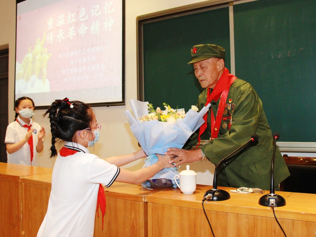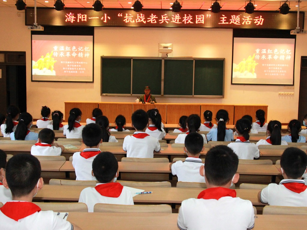 今年是庆祝抗日战争胜利77周年,为认真贯彻落实习近平总书记“把红色资源利用好、把红色传统发扬好、把红色基因传承好”的指示精神,9月2日上午,休宁县新时代文明实践中心、县教育局、县退役军人事务局联合在海阳一小开展了“重温红色记忆 传承革命精神——抗战老兵进校园”主题活动,91岁的抗战老兵白志明老同志应邀走进校园,为孩子们讲述抗日战争故事。活动由汪霞副校长主持。