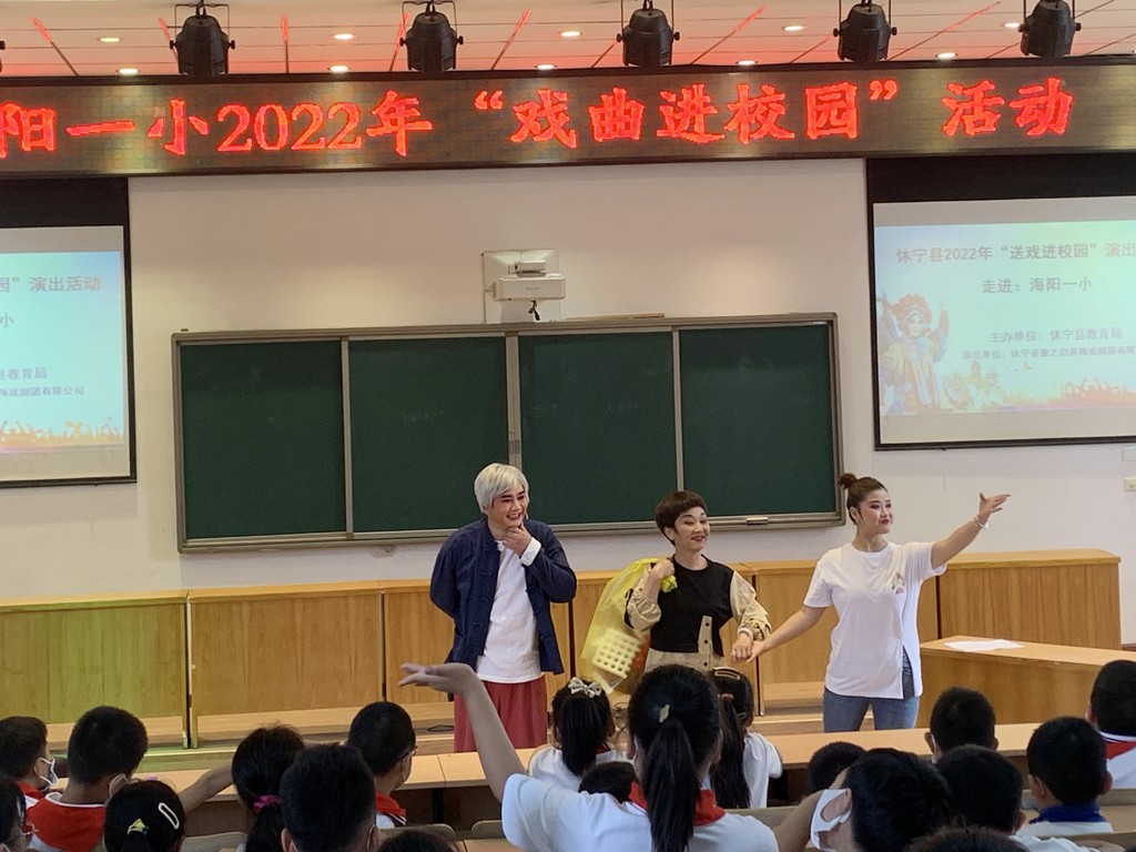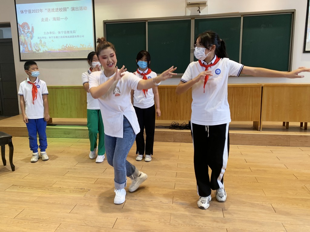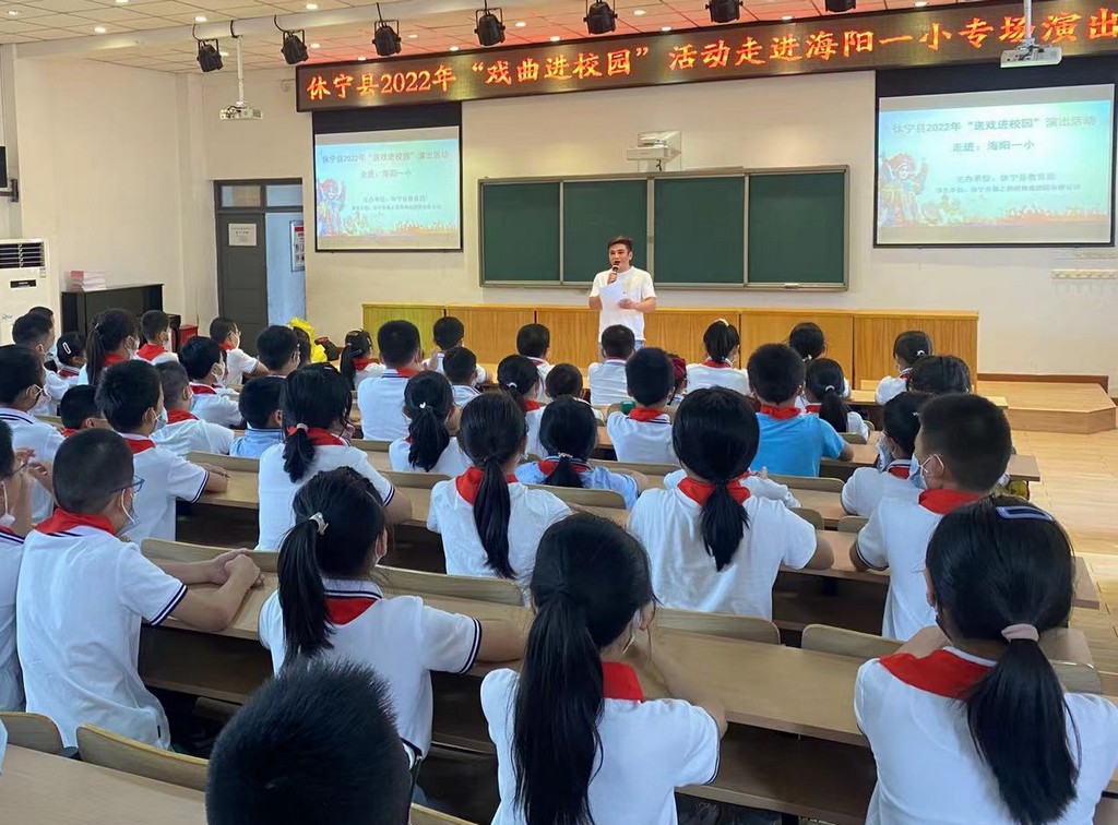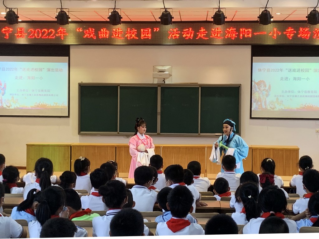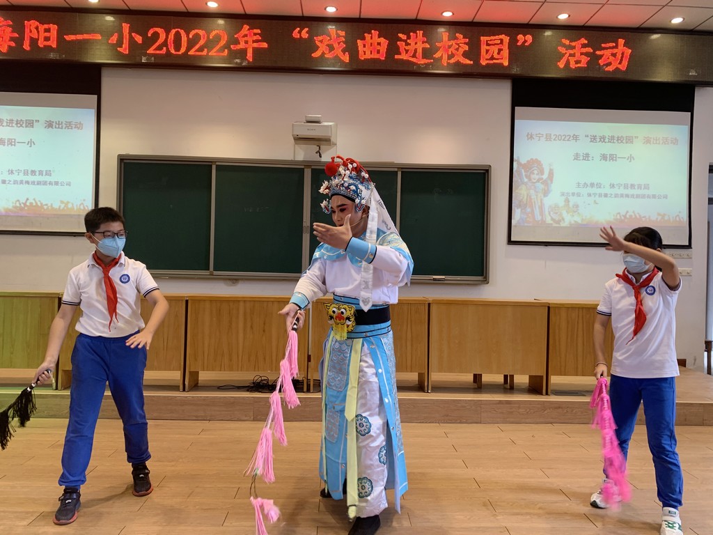 为弘扬中华民族优秀传统文化,展现国粹精华,9月21日上午,由休宁县教育局主办、休宁县徽之韵黄梅戏剧团有限公司承办的休宁县2022年“送戏进校园”演出活动走进海阳一小。为师生们带来精彩的戏曲表演及戏曲知识科普,让大家与戏曲亲密接触,感受黄梅戏文化的魅力,给同学们带来一场视听盛宴。