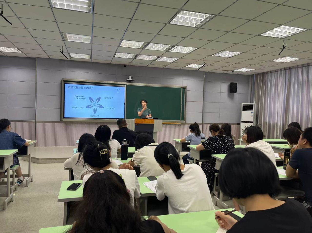 本次活动从学科出发,分语文数学两场。数学专场由罗新敏、王文华、朱传英三位资深教师分别就班级管理、教育措施、日常练习三个方面分享了他们的教育教学智慧。语文专场由方素芬、张丽霞、方盛三位资深教师分别就教学常规、作文指导、后进生的转化三个方面传授了他们的宝贵经验。组内青年教师认真汲取经验,并向老教师们提出自己的工作困惑。同时也吸引了校内其他年级组的青年教师们前来拜师学艺。最后海阳一小校长张胜利总结发言,进一步对青年教师提出了要求与期望。
