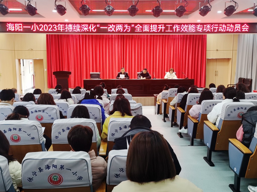 为深入贯彻落实“一改两为”精神,进一步改进工作作风,促进学校高质量发展, 3月6日,休宁县海阳一小在学校多功能厅召开持续深化“一改两为”、全面提升工作效能专项行动动员会,由汪霞副校长主持。