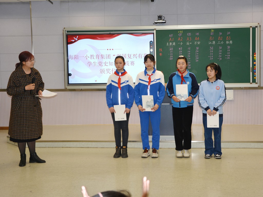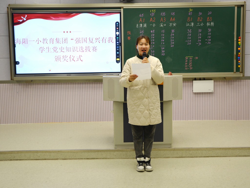 海阳一小胡莉莉主任宣布了个人赛成绩及集团组队参赛名单。海阳一小张胜利校长和各校领导老师为集体奖获奖单位颁奖。