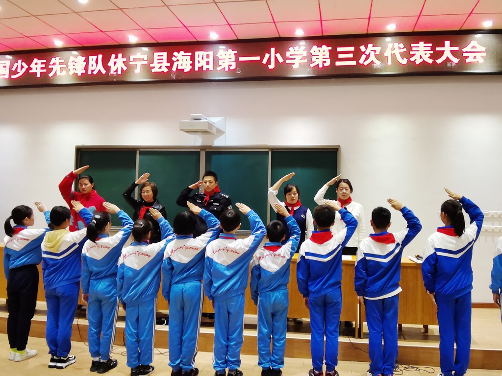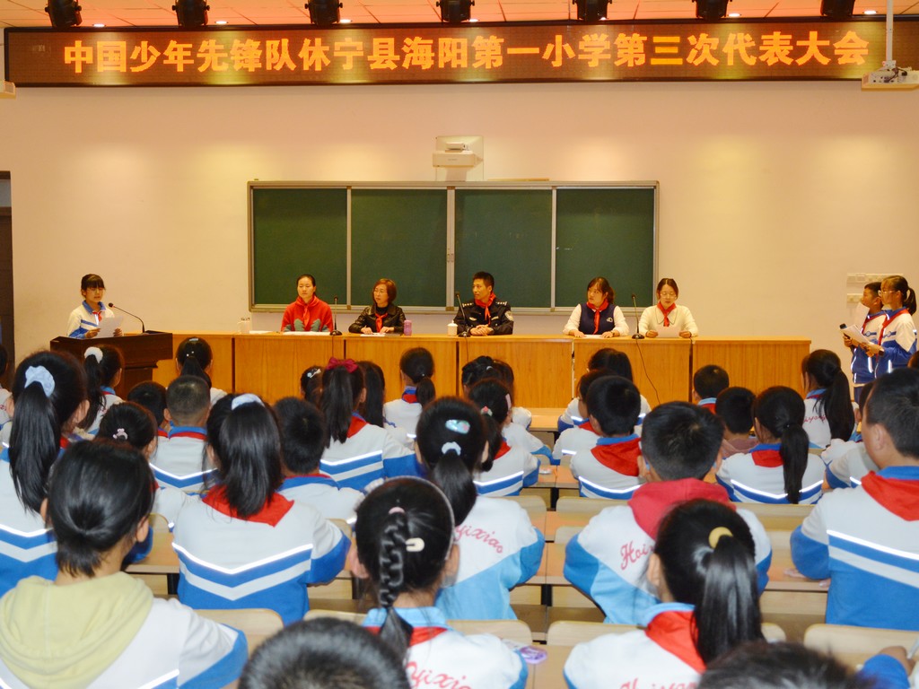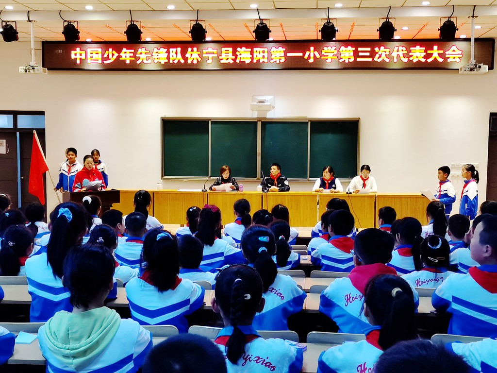 休宁县海阳一小少工委副主任汪霞受校少工委主任张胜利委托致开幕辞,对全体少先队员赋予了亲切的关怀,寄托了殷切的希望,鼓励全校少先队员学习好少代会精神,争做新时代优秀少先队员。