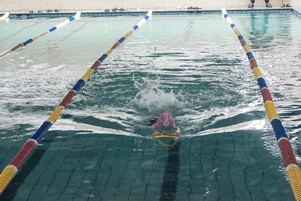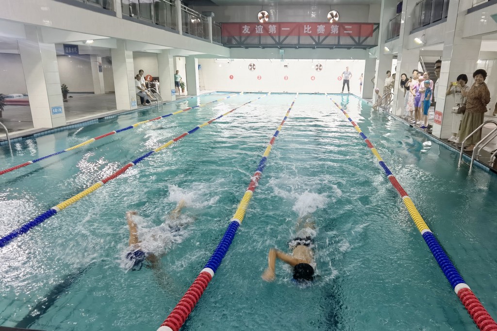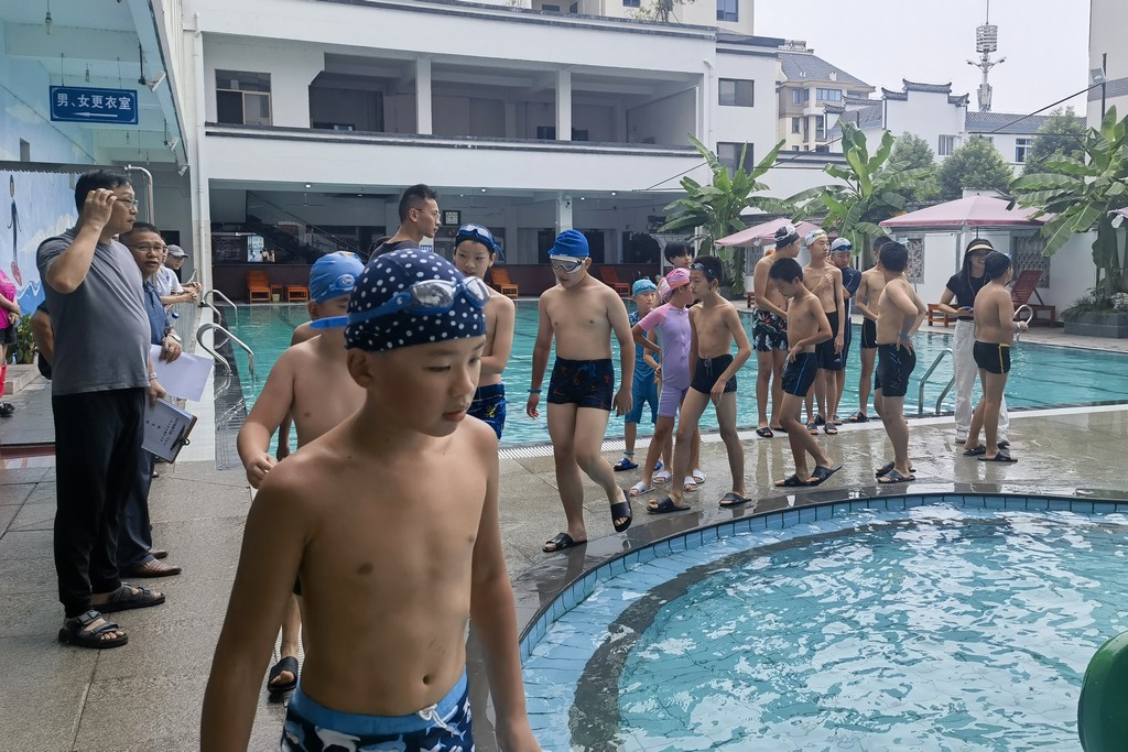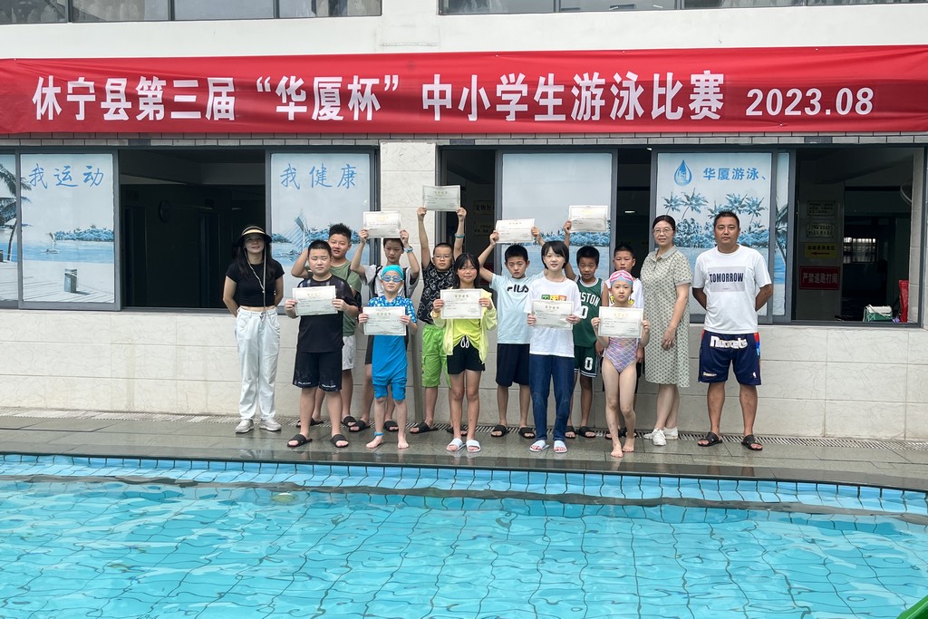 “海阳一小的选手入水动作真漂亮!”休宁县华夏池游泳馆内传来观众们的阵阵赞叹声。