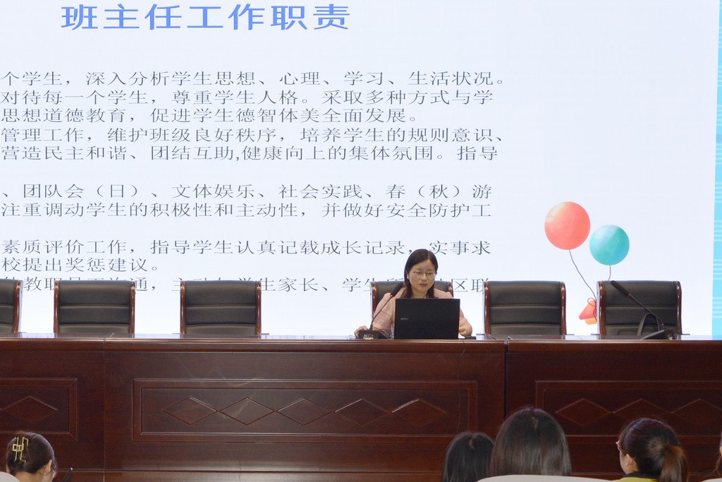 刚刚荣获省级班主任基本功大赛奖项的汪永梅老师现身说法,对新进教师进行了班主任培训。她从“班主任工作职责,开学工作要求,班主任常规工作要求,班主任工作心得分享”四个方面对新进教师进行了培训。