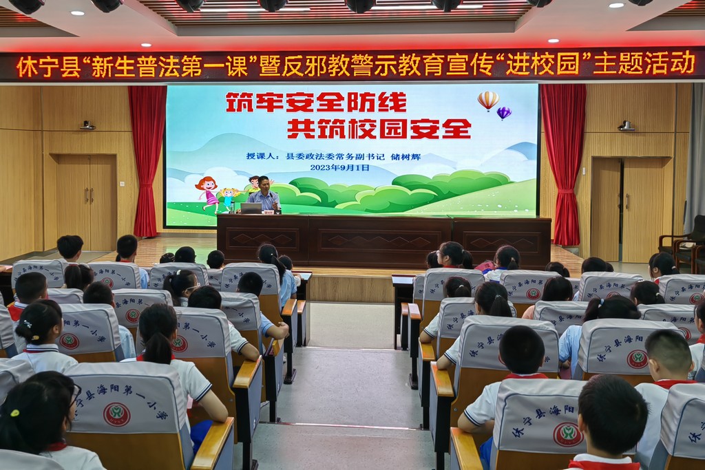 开学第一天,学校邀请休宁县委政法委副书记储树辉来校,为学生开展以“筑牢安全防线 共筑校园安全”为主题的普法宣传讲座。储副书记从预防校园欺凌、防范电信网络诈骗、防范抵制邪教三个方面对学生进行浅显易懂的讲解,学生受益颇多。学校安全办还组织学生开展“开学安全第一课”教育,从防溺水、消防安全、食品安全……六个方面展开。