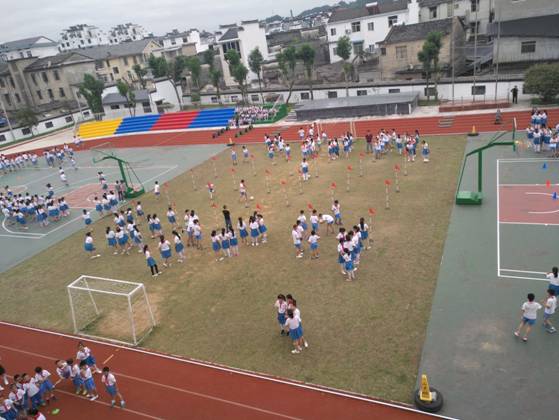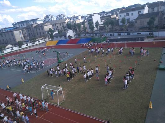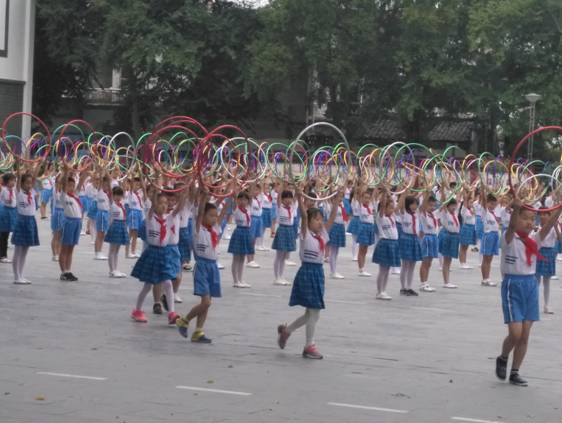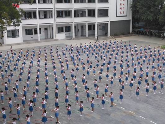 田径场(广播操和校园啦啦操)、教学楼前广场(少儿游戏、团队跳长绳)、行政楼前广场(校园三字经跳皮筋)。
