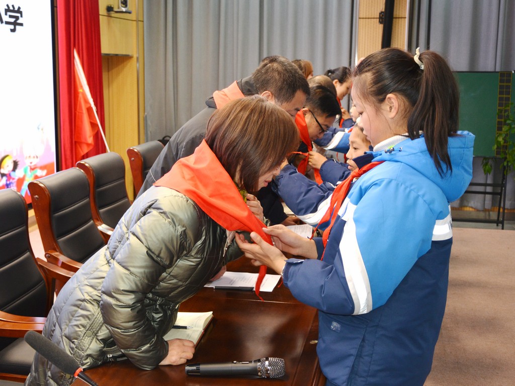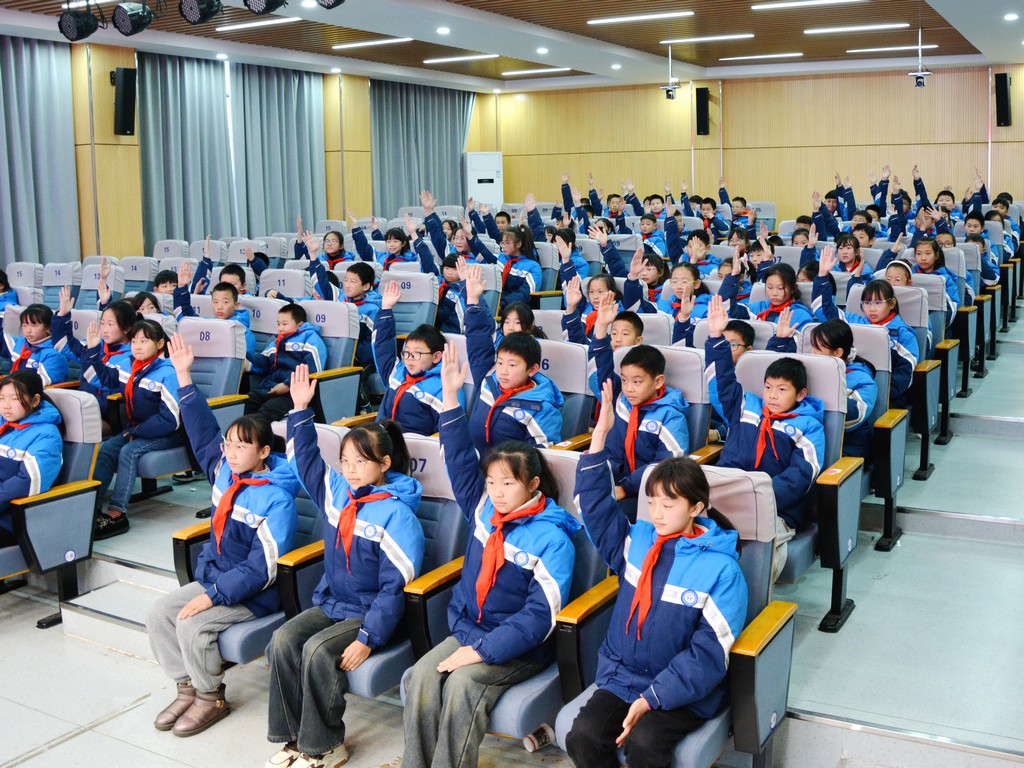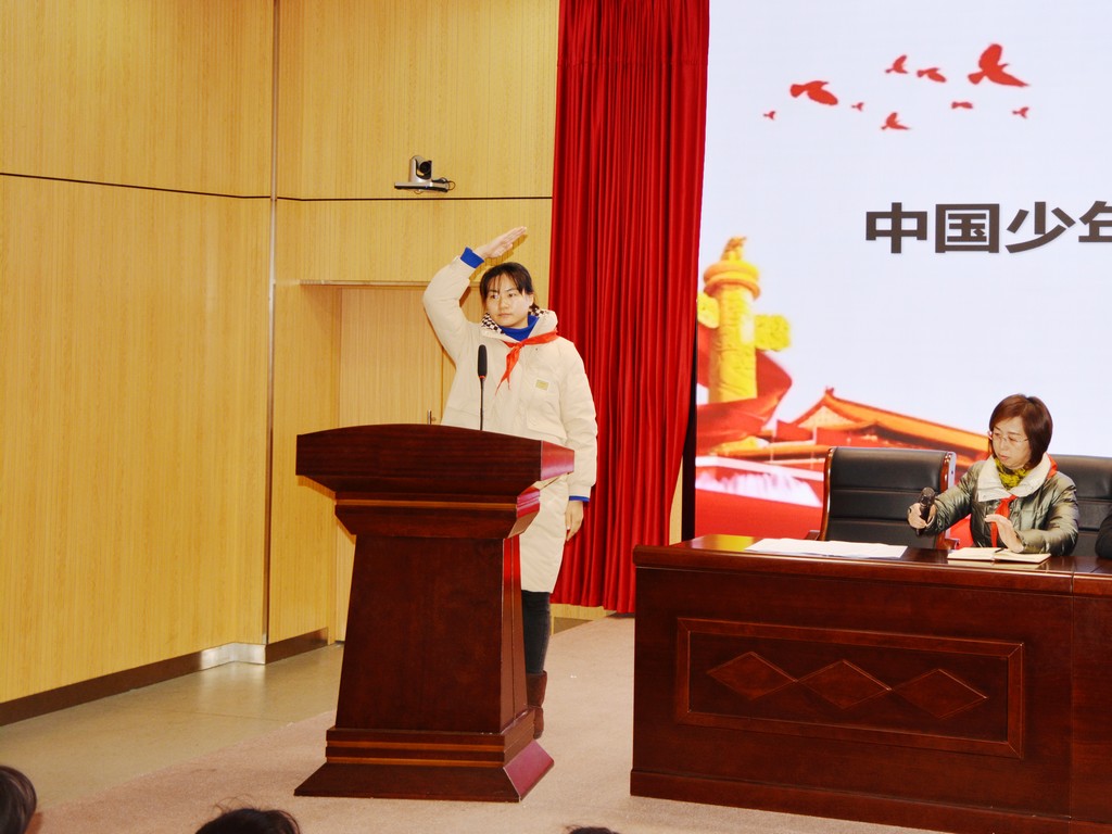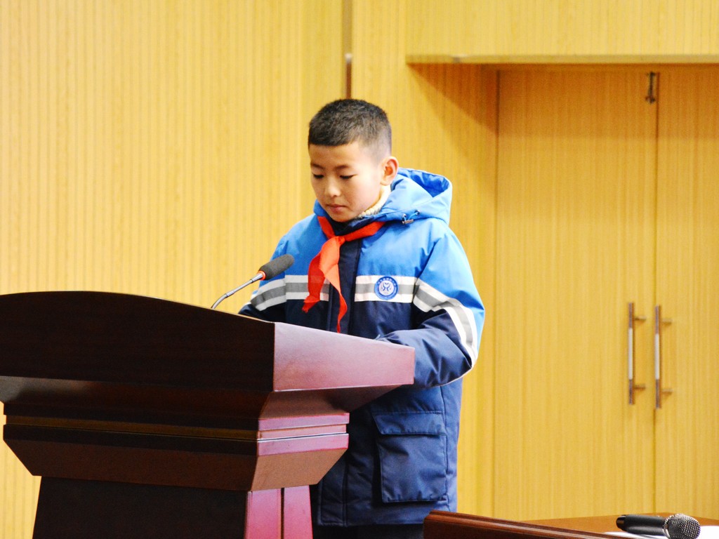 少工委主任、党总支书记、校长张胜利代表新一届委员发言,他鼓励队员们要树立远大理想,在学习中增长知识,用自己的实际行动为队旗争荣誉,为国旗添光彩。同时,他对会前征集到的“红领巾小提案”做了现场答复。