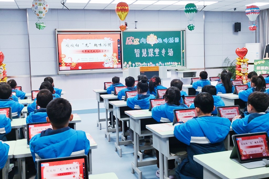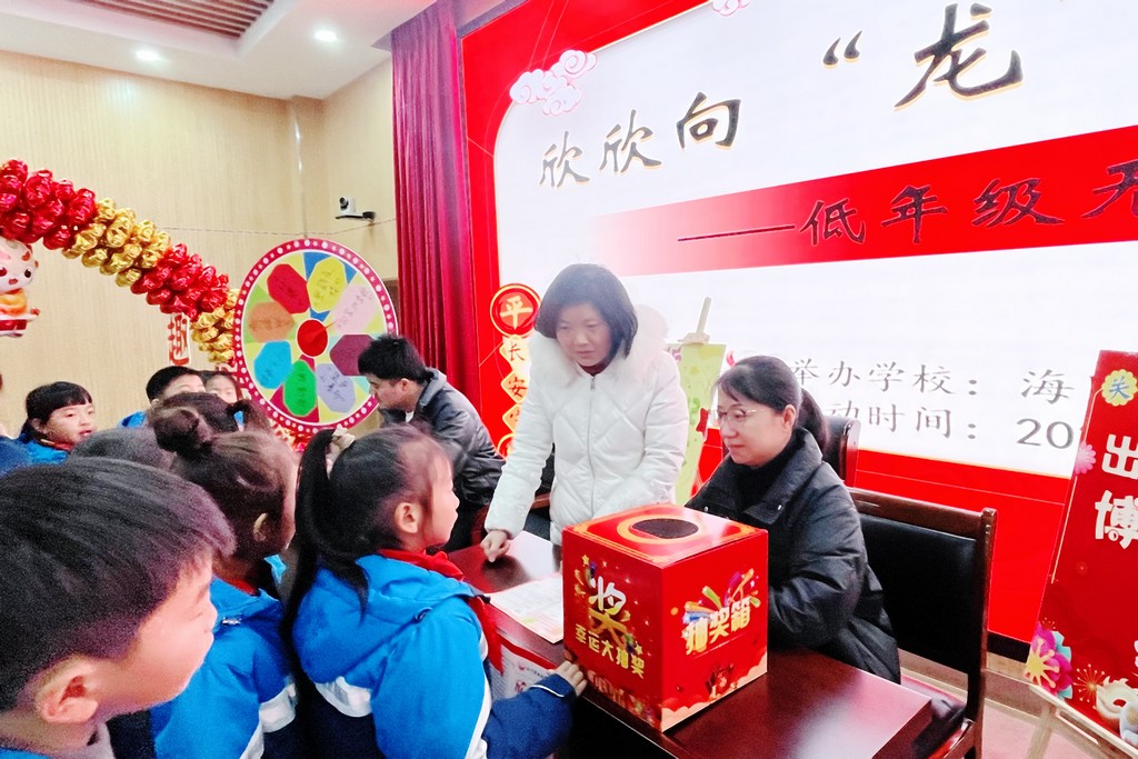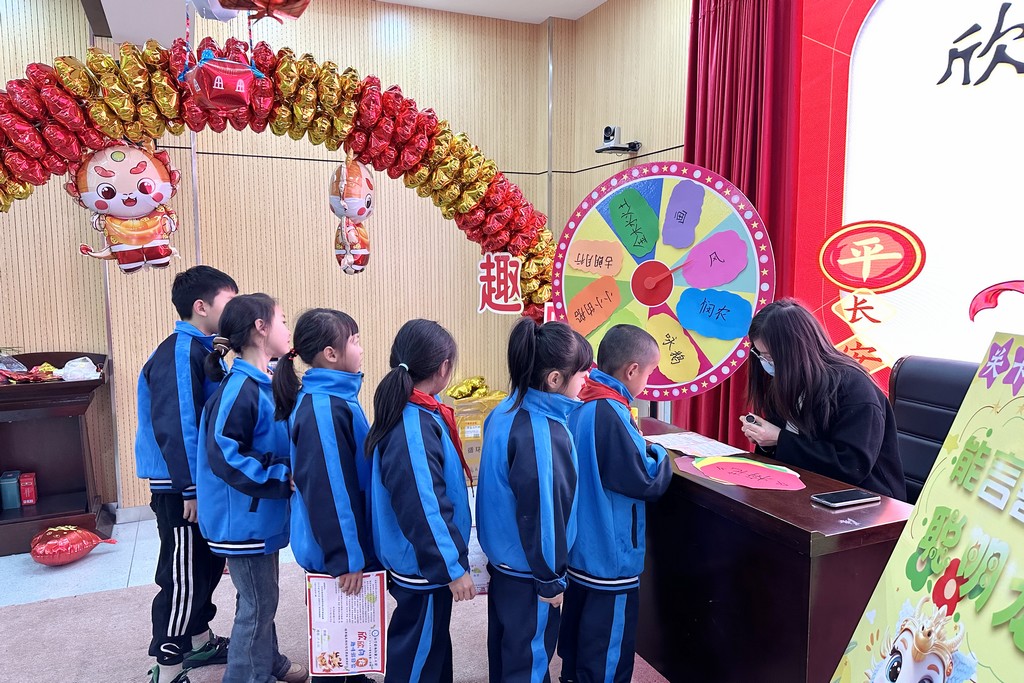海阳一小教导处精心组织,省级课题《小学生讲好百年红色故事的实践研究》和市级课题《基于学业质量标准的小学低年级数学教学策略研究》《育新人、兴文化:小学生全阅读的创新实践研究》三个课题组共同参与设计,以中华传统文化中“龙”为吉祥物,结合智慧课堂,进行一次传统与现代的融合之旅。孩子们手持游园卡,积极参与,敢于表达,集齐龙年勋章,在形式多样的闯关活动中感受着游园的独特魅力。