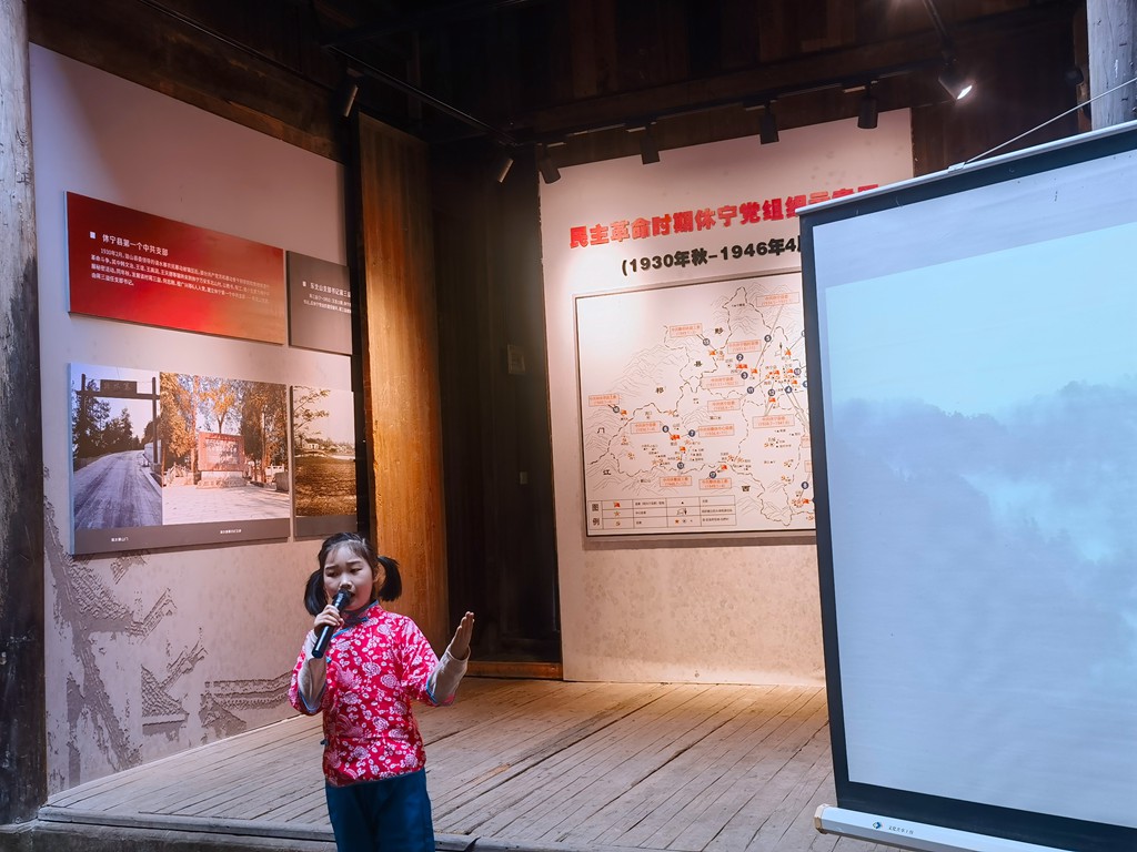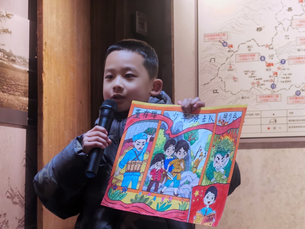 随后,学生汇报展示了课题组前期开展的活动。三名学生分别展示一幅红色绘画作品,演唱一首红色歌曲,讲述一个红色故事。