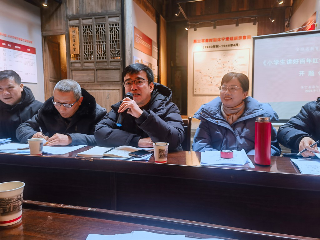 深冬有寒意,科研有热情。1月30日上午,休宁县海阳一小2023年省教育装备课题《小学生讲好百年红色故事的实践研究》开题报告会议在休宁县红廉展示馆举行。此次开题报告会特邀市电教馆唐龙馆长、市教科院小学数学教研员高娟娟、县电教馆馆长胡有为、县教育局教研室副主任谢红兵、县教育局语委办主任程周到位指导。同时与会的还有海阳一小书记张胜利、副校长汪仲尧、教导处主任胡莉莉、教导处副主任方素芬和全体课题组成员。会议由汪仲尧副校长主持。