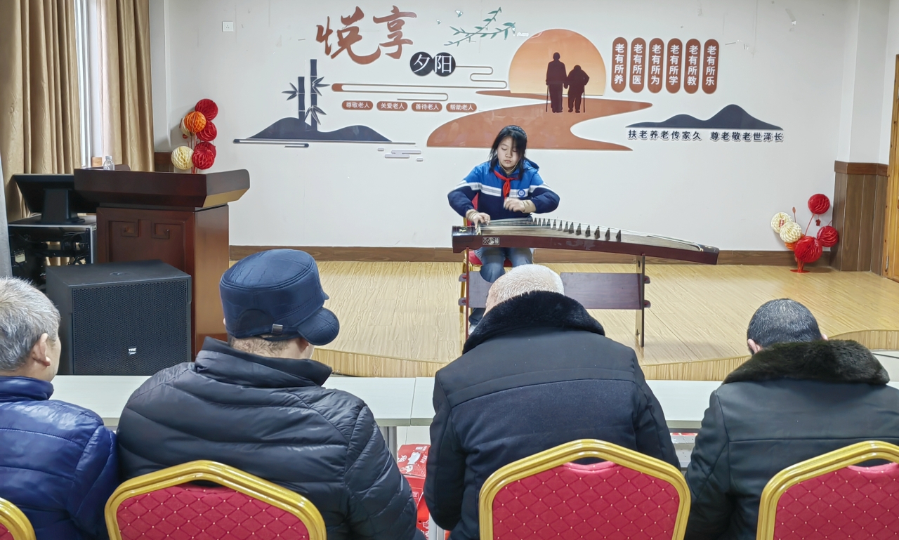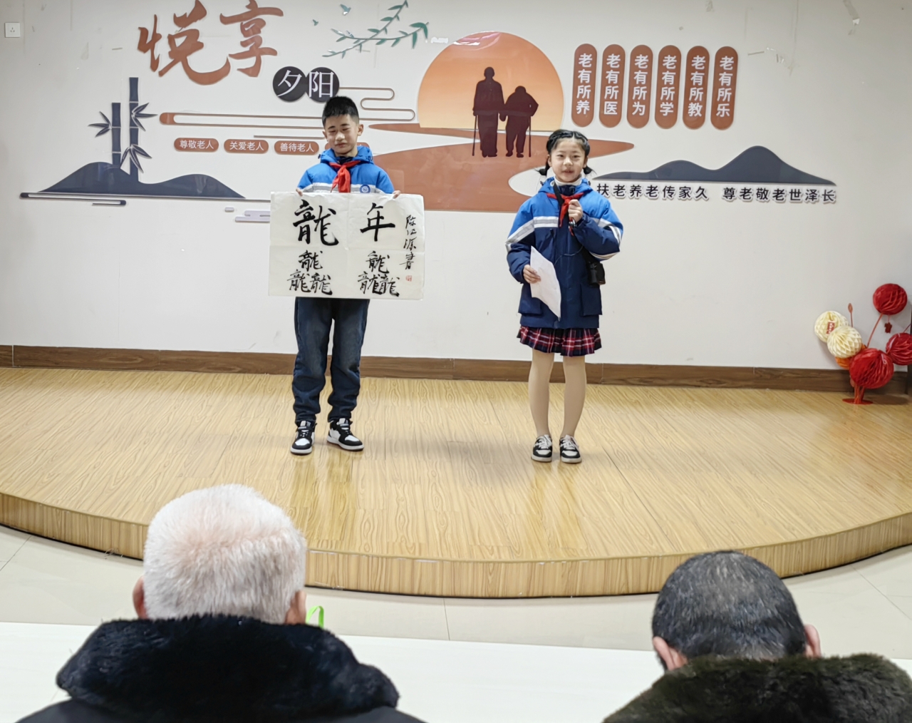 节目表演现场,队员们为老人带来民族舞、现代舞、朗诵、书法、古筝演奏、歌曲等节目,丰富多彩的节目表演让老人们看得目不转睛,不时露出开心的笑容。