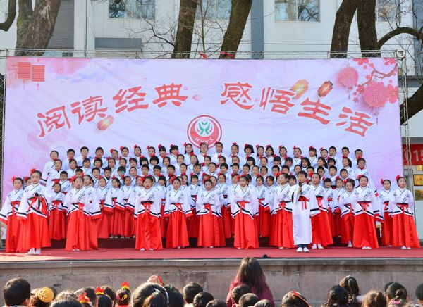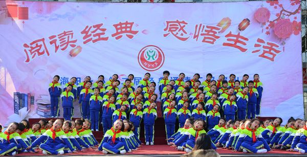 2014年以来,海阳一小确定每年12月为校园读书节。学校坚持每天“晨读、午练、暮省”,晨读《弟子规》,午练《三字经》,暮省《中华传统经典导读》,精心开展汉字听写大赛、讲故事比赛等活动,丰富学生知识,提升文学素养。此次经典诵读汇报演出,是对一个月来学生诵读经典成果的一次全面展示。汇报演出过程中,学校还对活动优胜者进行表彰。