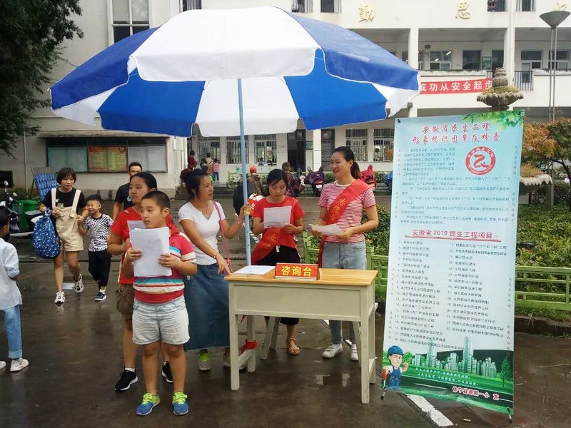 9月1日,利用家长带学生报名的时机,设立咨询台,利用展板展示及志愿者发放教育民生工程宣传单200余份,让家长明白安徽省民生工程形象标识图案及释意,了解安徽省2019年实施33项民生工程内容。