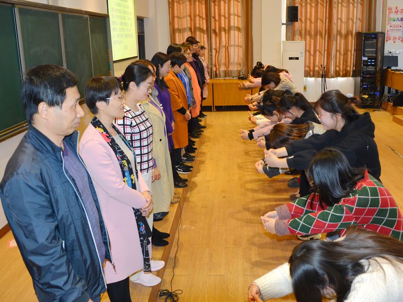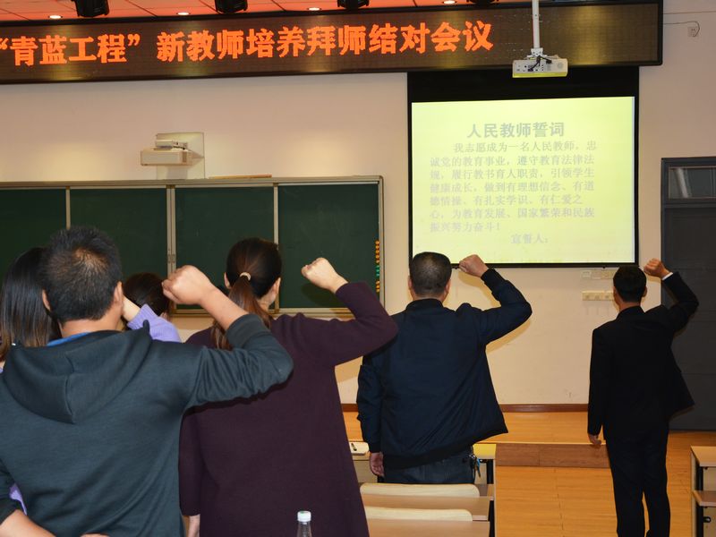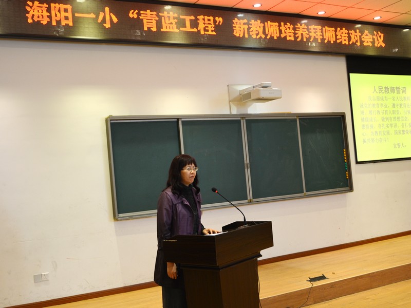 为加强海阳一小新教师培养工作,10月31日中午,在校多媒体教室举行“青蓝工程”新教师培养拜师结对仪式,教导处副主任胡莉莉老师主持会议并教授古代拜师拱手礼。