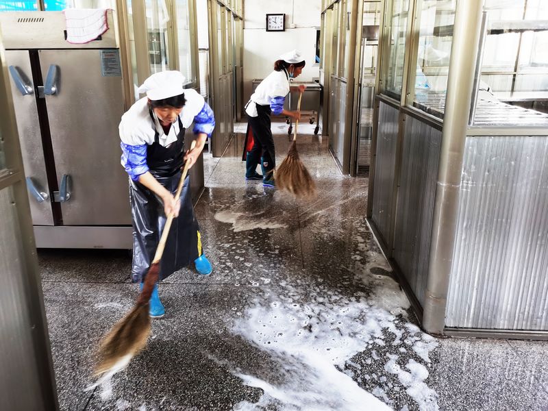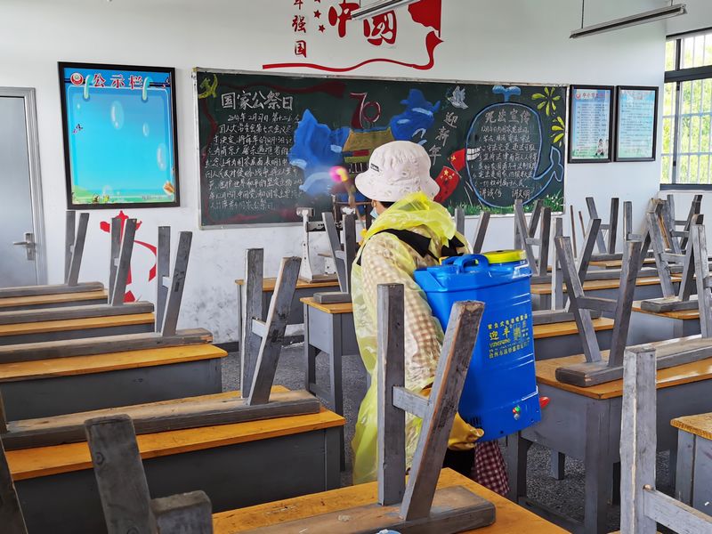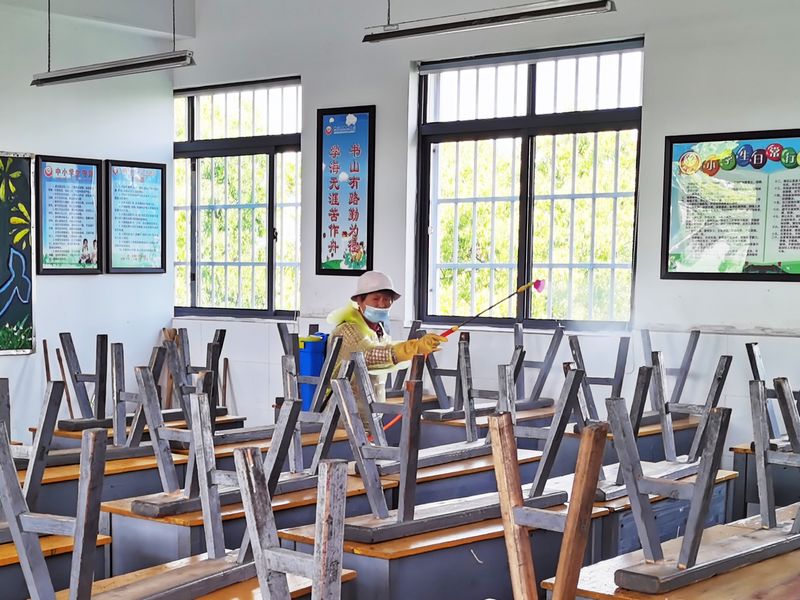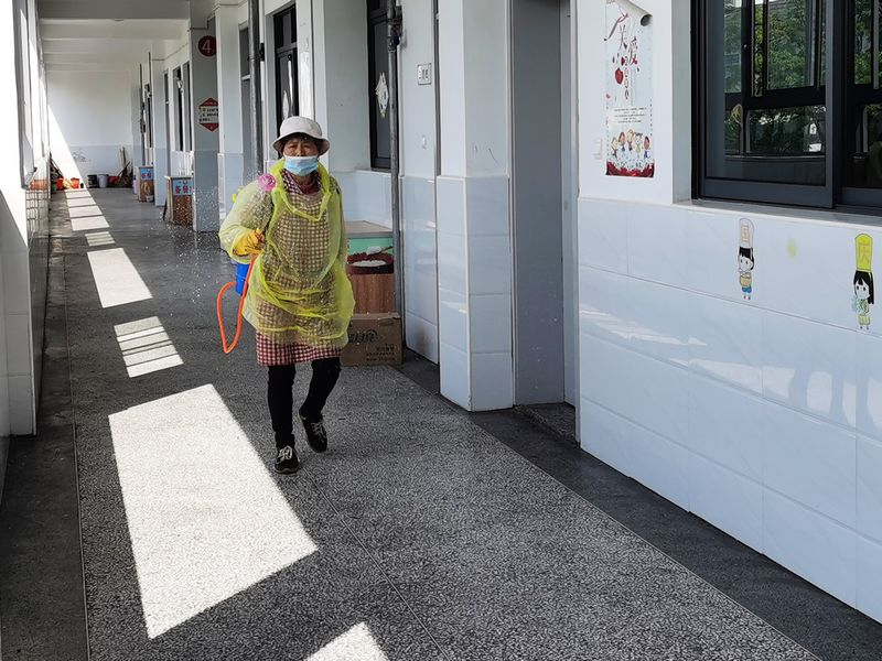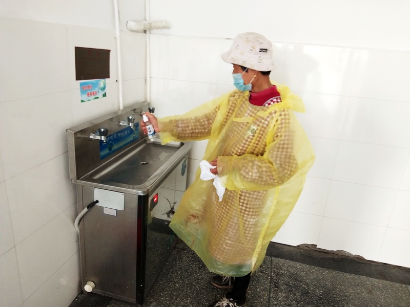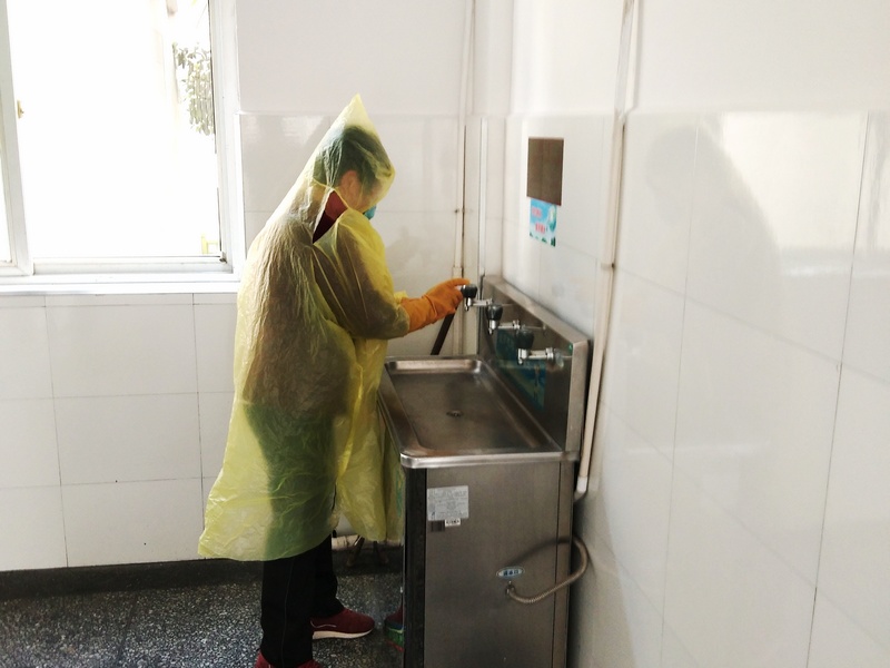 为迎接四、五、六年级返校复学,4月26日,海阳一小安排工作人员对校园环境卫生进行全面清扫和消毒工作,运用84消毒液对教室、食堂、运动场、办公室、厕所等场所进行消毒,对饮水机、水龙头进行酒精消毒,力求不留卫生死角,全面改善校园环境卫生条件。(洪文斌 图片编辑:程新凯)