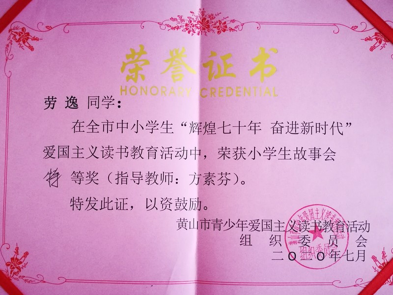 7月17日,黄山市“辉煌七十年 奋进新时代”爱国主义读书教育活动中小学生演讲、讲故事比赛在屯溪举行。由于疫情原因,此次比赛采取提交录制视频,现场评分的方式进行。黄山市三区四县推送的30余名优秀选手个个准备充分,情绪饱满,经过激烈角逐,休宁县海阳一小五(6)班劳逸同学以9.556分脱颖而出,获得小学生讲故事比赛特等奖,将代表黄山市参加省级比赛。